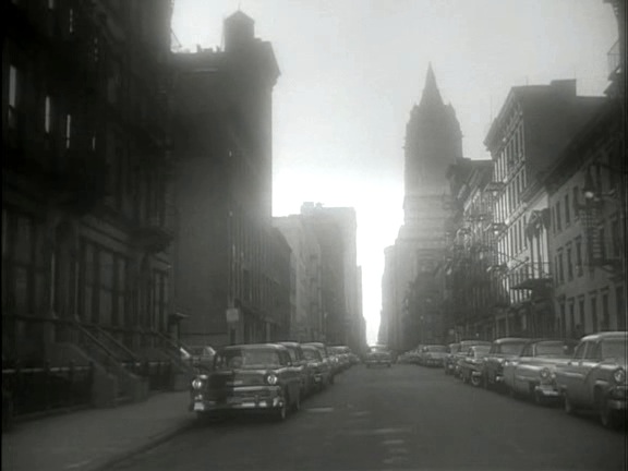 What makes Odd Against Tomorrow a work of art? Undoubtedly it is the result of a synergy grown from the craft and commitment of a talented film-making team. I have spoken of the screenplay and the cast, and now I need to address the polished achievements of those that put the movie together. Together with DP Joseph C. Brun, Wise re-casts New York as the noir city, with a deep focus, canny lighting, and killer perspectives. As a cinematic city of a haunting cold beauty, a brooding realm where its denizens tread bright boulevards in a bleached-out bizarre dream dreamt by ‘mad men’. The AFI informs us that in an interview Wise said: “I did something in Odds Against Tomorrow I’d been wanting to do in some pictures but hadn’t had the chance. I wanted a certain kind of mood in some sequences, such as the opening when Robert Ryan is walking down West Side Street…I used infra-red film. You have to be very careful with that because it turns green things white, and you can’t get too close on people’s faces. It does distort them but gives that wonderful quality—black skies with white clouds—and it changes the feeling and look of the scenes.” [Robert Wise On His Films (Silman-James, 1995) p. 157]. Those stark monochrome compositions are wonderfully evident in scene after scene. The framing and lighting is stunning. Indeed, the picture has a sort of late-period neo-realism with a French noir patina. The photography shows a city in the throes of a radical re-invention that is adopting the angular mood evident in the new model cars on its streets – all thrust, sharp angles, and fins. The doomed protagonists stand out as anachronisms in this bold new world, and only Johnny puts on a brave front with a flashy white sports-car and dark glasses.