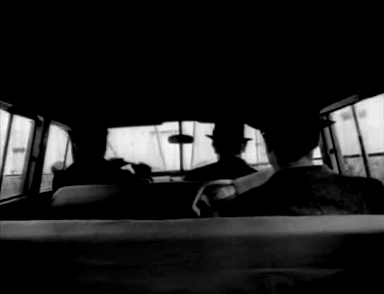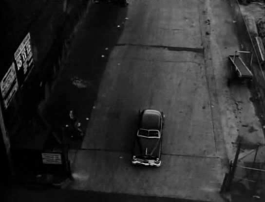 The opening titles are superimposed over the prelude to the hit, a stunning sequence that is sadly a false dawn, with the rest of the picture playing out at a plodding pace.  We see the perps drive from the waterfront to a tenement for the hit.  There is a wonderful gestalt at work with the contributions of composer Gilbert, DP Fred Jackman Jr., editor Russell F. Schoengarth, and director Arnold Laven, who  together create one of the most arresting sequences in a Hollywood crime movie ever.  These scenes are beautifully paced and edited, shot from a plethora of angles, including elegant aerial and tracking shots, and from inside the car – all perfectly lit.  You just want the titles to get the hell out of the way!